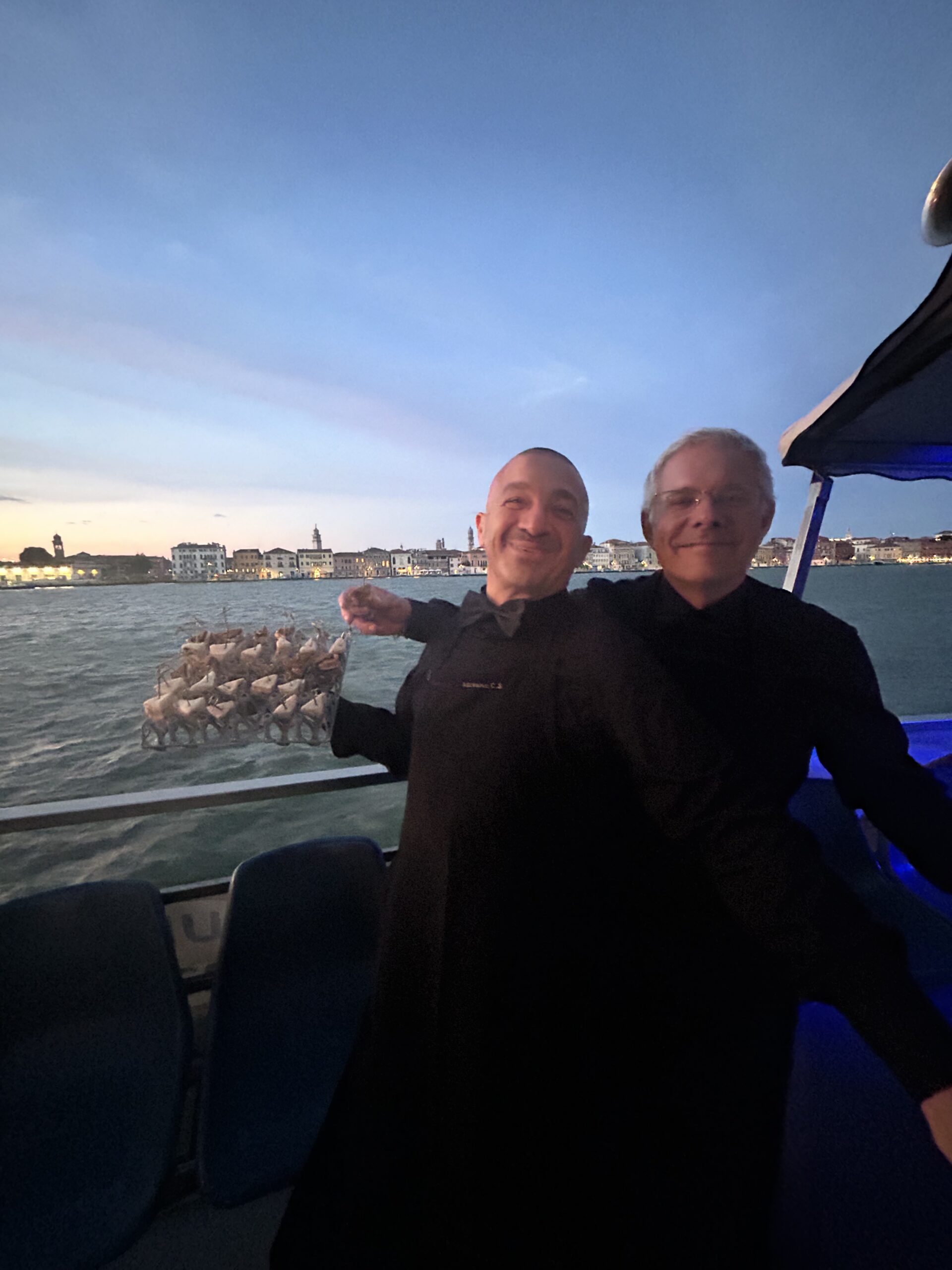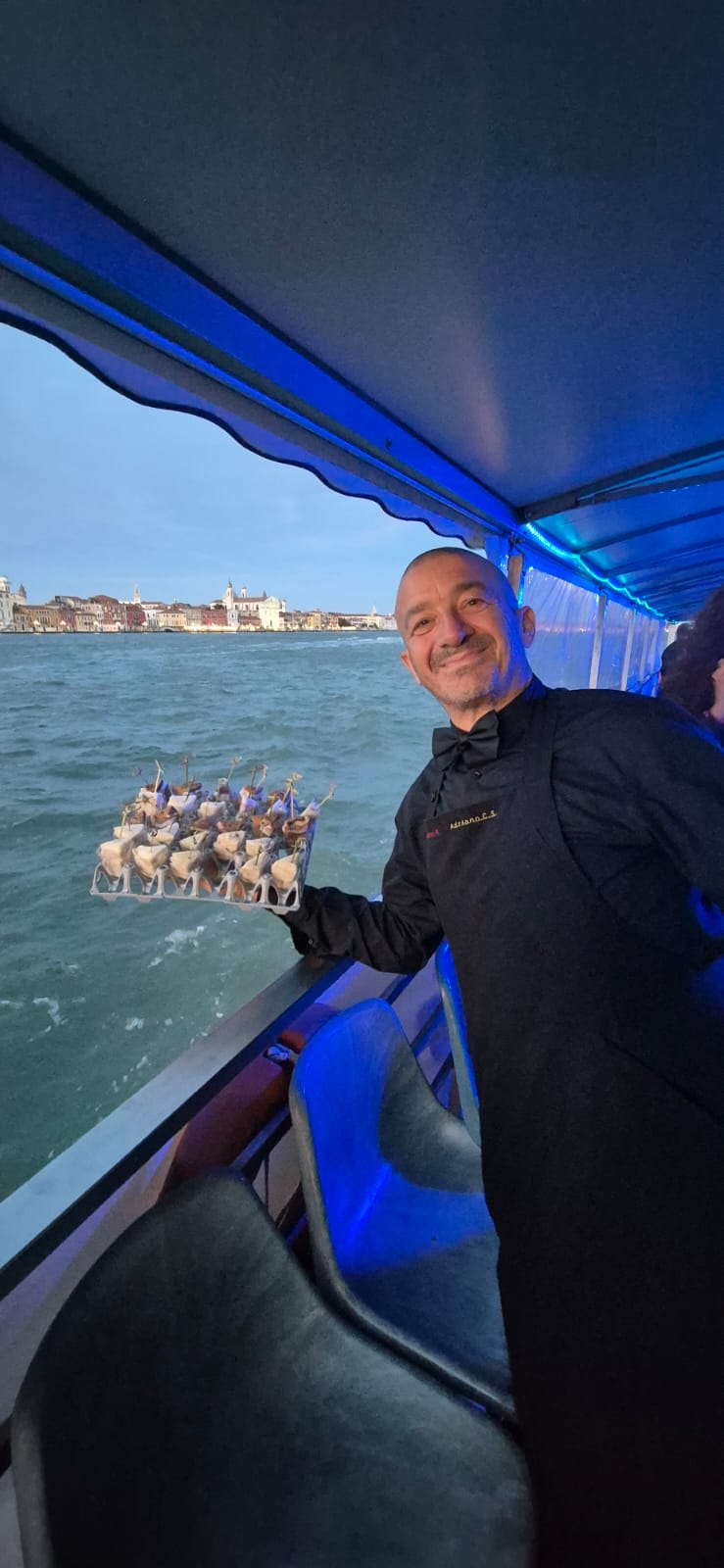 Data e local: 17 de setembro de 2024 – Veneza, aperitivo servido a bordo de uma embarcação atracada em frente ao Hotel Hilton Molino Stucky